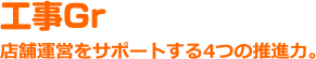 工事部は、店舗デザインと施工に関連した、設計・デザイン・メンテナンス業務を担当。確かな専門知識と豊富な施工実績を持つスタッフが、「店舗デザイン開発」をはじめ、「店舗リフォーム工事」「店舗サイン工事」「店舗メンテナンス」 という4 つの業務を総合展開しています。